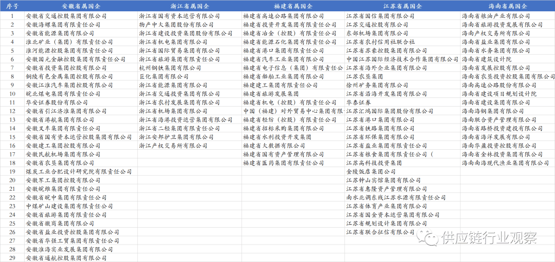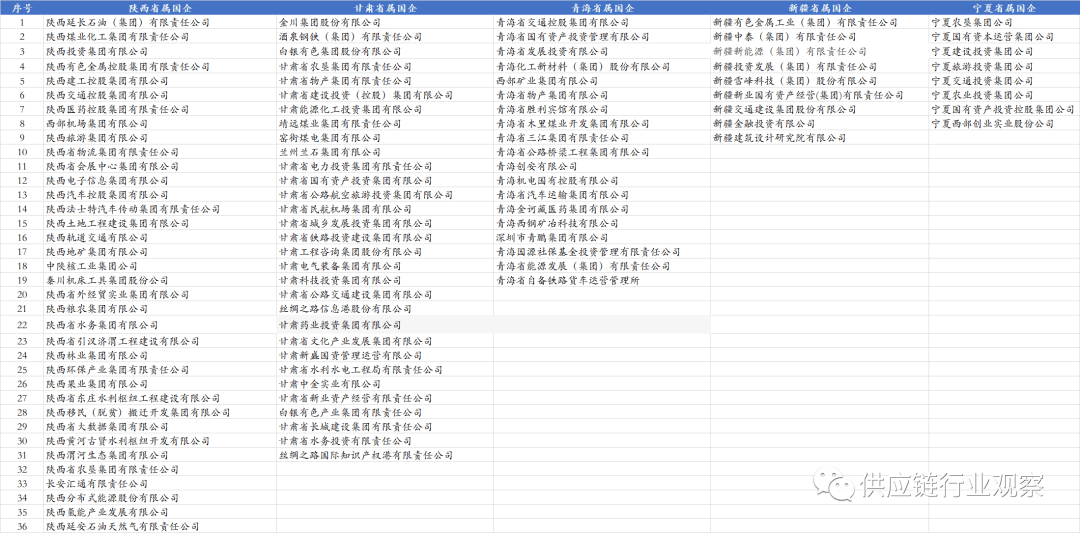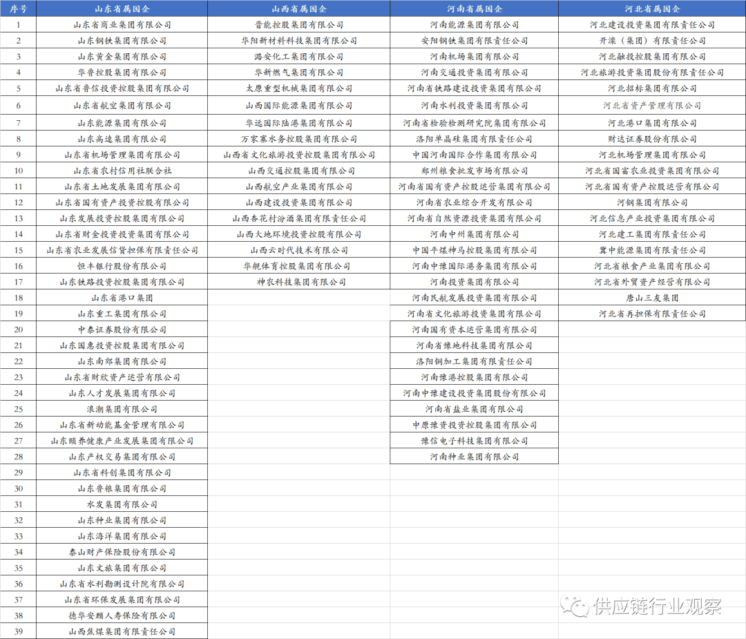 我国目前各类央企共243家,此中有列入国务院国资委央企名录的央企98家、列入财务部地方企业名录的央企145家。这些央企和国企正在2022年的停业收入是82。6万亿,净利润是4。32万亿,上缴税收5。93万亿。约有员工3390万。4月3日,易华录发布通知布告暗示公司收到现实节制人中国华录集团无限公司(以下简称华录集团)通知,华录集团正正在取中国电子科技集团无限公司(以下简称中国电科)规画沉组事项,华录集团拟整合进入中国电科。华录集团取中国电子科技集团整合后,国务院国资委监管的地方企业数量或将由现正在的98家削减为97家。排名1-53的为副部级央企。前53家地方企业的董事长、党委(党组)、总司理的人选由地方局常委会研究决定,这取一般副部长级干部的任免权限不异,因而被认为相当于副部级干部。所以,前53户正在报道中被称为中管企业,可是正在地方发文中,一般称为部门国有主要企业。除前53家央企,其余央企的代表人(大都是董事长)须报国务院党组任前存案同意。其监管由国务院国资委企业带领人员办理二局(简称“企干二局”)担任。前1-10为涉军工央企,别离为:中国核工业集团、中国航天科技集团、中国航天科工集团、中国航空工业集团、中国船舶集团、中国刀兵工业集团、中国刀兵配备集团、中国电子科技集团、中国航空策动机集团、中国融通资产办理集团。第11-22为能源类央企,此中11-14为石油类央企,别离为中石油、中石化、中海油及国度石油天然气管网集团;15-22为两大电网(南方电网、国度电网)及六大发电集团(华能、大唐、华电、国电投、三峡和国度能源集团);23-27为通信及电子消息央企,别离为:中国电信、中国联通、中国挪动、中国卫星收集集团、中国电子消息财产集团;28-33为配备制制类央企,别离为:中国一汽、春风汽车、中国一沉集团、中国机械工业集团、电气集团、中国东方电气集团;34-37为矿产资产类央企,别离为:鞍钢、中国宝武、中国矿产资本集团、中国铝业集团;38-41为交通运输行业央企,中国近海海运集团、中国航空集团、中国东方航空和中国南方航空集团。42-43为涉农类央企,包罗中国中化和中粮。此外,包罗中国五矿集团、通用手艺集团、中建集团、中国储蓄粮集团、中国南水北集结团、国投集团、招商局集团、华润集团、中国旅逛集团、中国商飞集团分属分歧业业。此外,正在这98家央企中,国务院国资委核准的以金融为从业的央企共3家,包罗中国五矿集团等。以房地产为从业的央企共16家。地方金融企业名录由财务部发布,目前共27家。地方金融企业共分地方办理带领人员的金融企业(以下简称中管金融企业)和其他地方金融企业。其他地方金融企业则为施行国有金融本钱办理相关轨制,由财务部代表国务院履行国有金融本钱出资人职责,纳入国有企业运营预算办理、担任组织实施年度绩效评价等工做。此中中管地方金融企业15家,别离为中国投资无限义务公司、三大政策性银行(国度开辟银行、中国进出口银行、中国农业成长银行)、五大国有贸易银行(工行、农行、中国银行、扶植银行、交通银行)、两大金控央企(中信集团、中国人寿、承平安全、中国出口信用安全集团)。其他地方金融企业12家,别离为四大资产办理公司(华融、长城、信达、东方)、中债登、中国农业再安全、中国政企合做投资基金股份无限公司、国度融资基金无限义务公司、国度农业信贷联盟无限义务公司、中国再安全(集团)股份无限公司、中国建银投资无限义务公司及中国银河金融控股无限义务公司。由国务院授权财务部履行出资人职责的企业共4家,别离为中国国度铁集团、中国邮政集团、中国烟草总公司、北大荒农垦集团无限公司。 省属国企凡是正在区域内储蓄积累最优良的财产资本、金融资本和“行政”资本,此是开展供应链金融适宜的企业类型之一。外行业分布上看,省属国企次要涵盖金融、建工、交通根本设备投资扶植(高速公、轨道交通、铁扶植)、商业买卖(产权买卖、集中采购等)、物流根本设备(如机场、口岸)、矿产资本、林业资本、高端制制等,具有丰硕的供应链金融开展的场景。江山四省指河南、、山东、山西。这四个省,又被称为菜园子、气罐子、粮坛子、矿坑子。因各类资本取工农业资本不婚配,而被网友以“江山四省”自嘲之。但正在供应链金融范畴,我们认为这四个省的国企是走正在了全国相对前列的。以至正在政策、专营机构设置、平台扶植、产物立异等方面,四省的某些做法遥遥领先。按照各地国资委披露的监管企业名录,江山四省共有省属国企103家,数量上占全国比沉的16%摆布。此中,属国企38家、山西省属国企18家,河南28家,19家。具体名录如下,下表山西焦煤应为山西省属国企: 是国内首个出台供应链金融专项支撑财务政策的省份,供应链金融成长程度较高,部门国企设立了保理公司,搭建了供应链金融平台。以山东保养健康财产成长集团无限公司为例,旗下鲁康保理于2022年10月设立,本年1月,“山东健康信链”供应链金融办事平台启动投标,目前已完成投标。此外,属国企如山东口岸、山东高速、山东钢铁、山东能源等均连系本身环境建立了本身供应链金融办事系统,且多个平台规模已超百亿。据山港易付动静,2022年12月20日,山东口岸集团旗下供应链分析办事平台—“山港易付”平